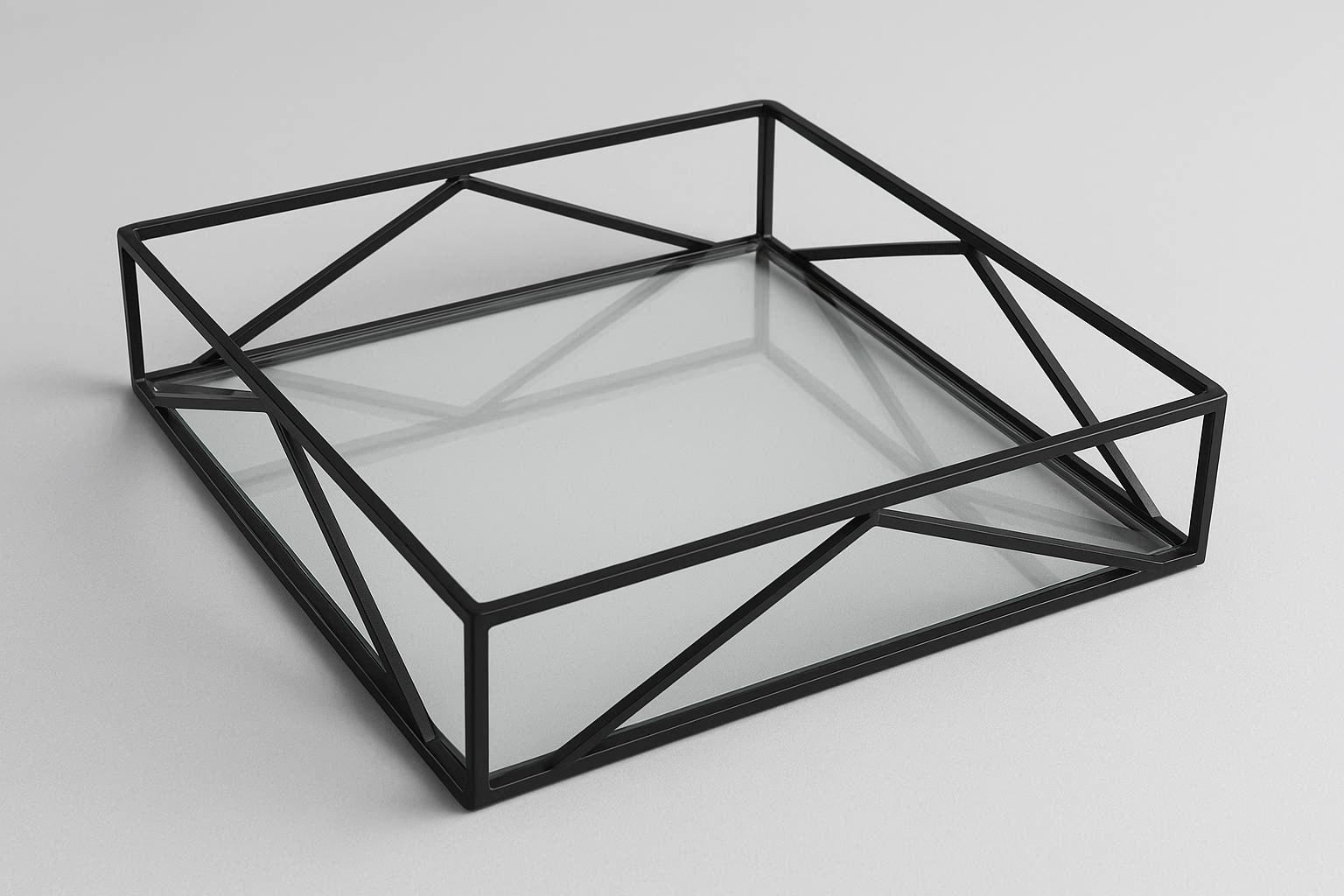 The angular design of the metal frame creates a contemporary silhouette that complements modern, industrial, or Scandinavian interiors. The glass insert provides a smooth, stable surface perfect for displaying candles, succulents, or a curated collection of coffee table books and objets d’art. The tray feels substantial and high-quality due to its weighted metal construction.